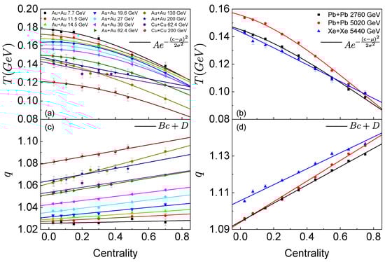 In Figure 4, the results of the centrality dependence of T and q for A + A collisions at different collision energies are presented. A nice parabolic fit can be performed for temperature T and centrality, see the solid lines in Figure 4a,b. The corresponding parameters are listed in Table 1. Unlike the temperature T, the dependence between q and the centrality is linear as shown by the linear fits in Figure 4c,d. The fit parameters are listed in Table 1 as well. The observation is that the temperature T decreases from central to peripheral collisions for all collision systems and energies as expected. This trend is universal and is consistent with the average momentum dependence of centrality []. The system can survive for a longer time in central collisions than in peripheral collisions since more nucleons are affected and more particles are produced in the collisions. Therefore more collisions can occur resulting in the higher temperatures for central collisions. The nonextensive parameter q increases from central to peripheral collisions, having the opposite trend respect to the temperature T versus centrality. Similarly to the discussion above, it indicates that the peripheral collisions are further away from thermal equilibrium and have larger temperature fluctuations than the central collisions for the same collision system and energy.