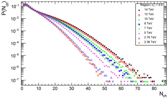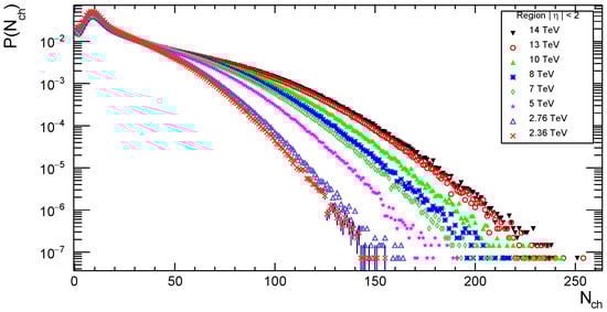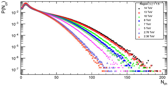 - ALICE Collaboration; Acharya, S.; Adamová, D.; Adolfsson, J.; Aggarwal, M.M.; AglieriRinella, G.; Agnello, M.; Agrawal, N.; Ahammed, Z.; Ahmad, N.; et al. Charged-particle multiplicity distributions over a wide pseudorapidity range in proton-proton collisions at = 0.9, 7, and 8 TeV. Eur. Phys. J. C 2017, 10, 852. [Google Scholar] [CrossRef]