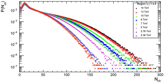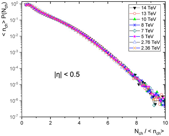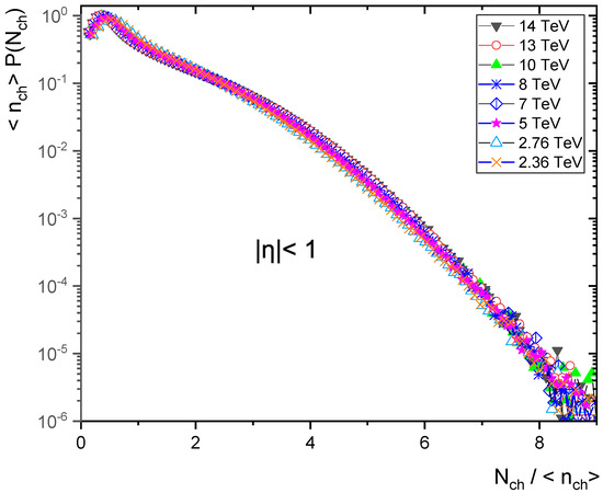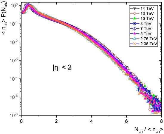 - Alner, G.; Ansorge, R.; Åsman, B.; Böckmann, K.; Booth, C.; Burow, L.; Carlson, P.; Declercq, C.; Dewolf, R.; Eckart, B.; et al. Scaling violations in multiplicity distributions at 200-GeV and 900-GeV. Phys. Lett. B 1986, 167, 476–480. [Google Scholar] [CrossRef]