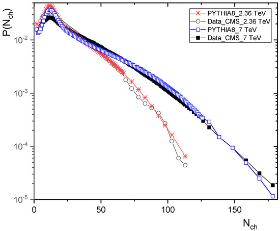 - CMS Collaboration; Khachatryan, V.; Sirunyan, A.M.; Tumasyan, A.; Adam, W.; Bergauer, T.; Dragicevic, M.; Erö, J.; Fabjan, C.; Friedl, M.; et al. Charged particle multiplicities in pp interactions at = 0.9, 2.36, and 7 TeV. J. High Energy Phys. 2011, 01, 079. [Google Scholar] [CrossRef]