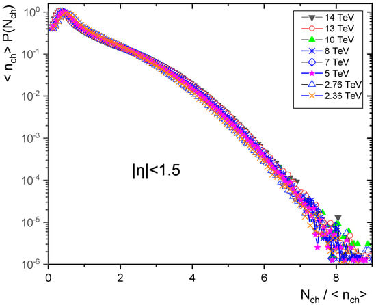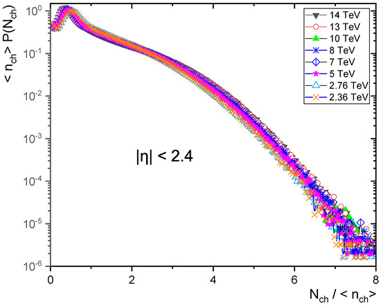 For hadron–hadron collisions, KNO scaling holds up to ISR energies [31,32], but significant scaling violations occur at = 200 GeV for both whole-phase space and central pseudorapidity range multiplicity distributions [26,33,34,35,36,37]. The UA5 experiment was the first to find a higher than predicted high-multiplicity tail and a shift in slope in pp collisions for wide rapidity ranges [26,38,39,40], which was considered as evidence for a multi-component structure of the final states [27,41]. Strong KNO scaling violations, as well as a change in slope in , were observed at an energy up to = 14 TeV, confirming the previous results at the below energies. This violation comes from multi-parton scattering and Semihard gluon radiation (minijets).