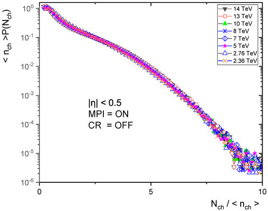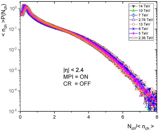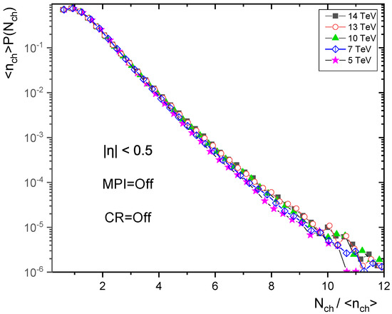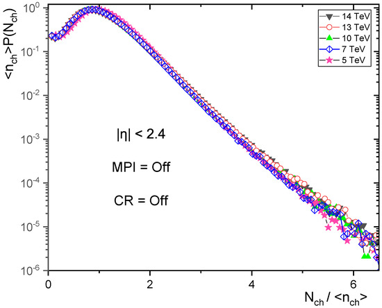 Some previous work studied the reason for the KNO violation in PYTHIA. In references [45,46], the authors studied the KNO scaling violation in an event-like jet, and they found that the basis of this violation is multiparticle interaction (MPI) and color reconnecting (CR). The microscopic mechanism of CR addresses the interactions that can exist between color fields during the hadronization phase. For testing this violation in minimum bias events, 20 million events were generated by PYTHIA8 without MPI and CR for energies = 5, 7, 10, 13 and 14 TeV and 5 million events were generated with MPI = ON and CR = OFF for energies = 2.36, 2.76, 5, 7, 8, 10, 13 and 14 TeV. As shown in Figure 12 and Figure 13, KNO is almost held when all MPI processes are switched OFF, which can be cleared when comparing them with Figure 7 and Figure 11, KNO scaling fails in the presence of MPI and when CR is OFF. Although CR reduces the mean multiplicity and makes it narrower, the KNO scaling is violated when it is switched OFF, as shown in Figure 12, Figure 13, Figure 14 and Figure 15. It is easy to assume that KNO scaling is violated when the one-to-one connection is cracked by complex QCD processes, such as single and double scatterings of parton linking different hard processes within one event, as well as softer MPI with the beam remnants [46]. We can see that the MPI and CR play essential roles in KNO scaling violations in the high pseudorapidity range.