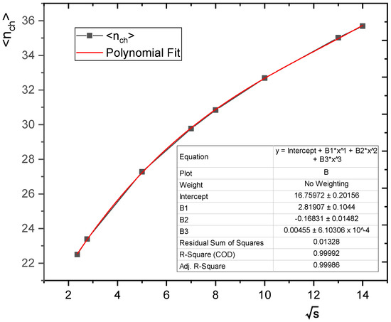 The fitting function of relation between the energy of collisions and mean multiplicity of a charged particle is the polynomial function in the form as shown below in Figure 16, where the values of the parameters are collected in Table 2.
