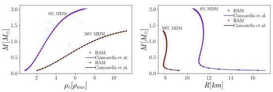 Left: Total mass values as a function of the total central density of the neutron star, for a pure baryonic star (blue line, magenta dots) and 50% mirror dark matter admixed star (black line, red dots). The density is expressed in units of the nuclear saturation denisty. The SLy EoS is used for both plots. Right: Total mass as a function of the radius, for the same neutron star models. The lines show data obtained as described in Ciancarella et al. [] and the overplotted dots result from our updated BAM version.