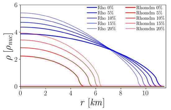 Density profiles of admixed neutron stars with a 0%, 5%, 10%, 15% and 20% mirror dark matter contribution to the total gravitational mass of 1.4 M. Blue lines refer to the baryonic density, while red ones denote the dark matter profiles. It is noticeable that with increasing dark matter content, the star has a more compact equilibrium configuration.