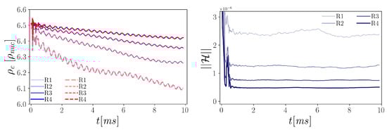 Left: Time evolution of the central density of baryonic matter (blue) and mirror dark matter (red) for the four different resolutions presented in this section. Right: Time evolution of the L2-norm of the Hamiltonian constraint for R1, R2, R3, and R4. The convergence order for the three highest resolutions is two. In all these runs the star is 50% dark matter admixed and has a total gravitational mass of 1.4 M and a baryonic mass of 1.56 M.