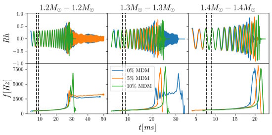 - Bezares, M.; Viganò, D.; Palenzuela, C. Gravitational wave signatures of dark matter cores in binary neutron star mergers by using numerical simulations. Phys. Rev. D 2019, 100, 044049. [Google Scholar] [CrossRef]
