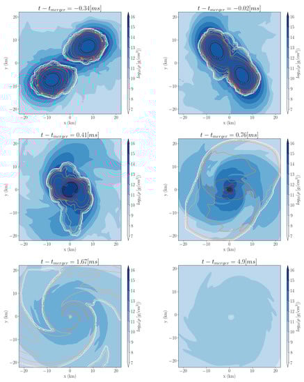 Snapshots on the equatorial plane of the 1.3 M–1.3 M simulation with dark matter. x and y are in isotropic coordinates. The colormap represents the of baryonic rest mass density in cgs units. The contours represent the same quantity for mirror dark matter.