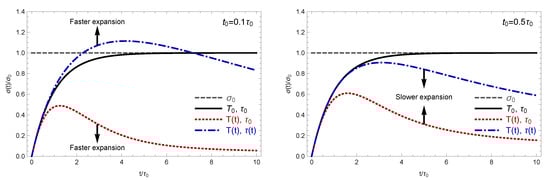 The time-dependent conductivity (21) is shown with the blue dash-dotted line in Figure 1. The two panels display the results for different sets of model parameters, i.e., t 0 = 0.1 τ 0 (“fast” expansion) and t 0 = 0.5 τ 0 (“slow” expansion). It is interesting, although perhaps not surprising, that the expansion-driven increase in the transport relaxation time enhances the electromagnetic response. One can also verify that the effect tends to grow with the increase in the expansion rate.