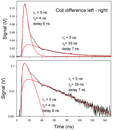 Linear and logarithmic plots of the differential signal from a current coil with a mainly positive particle signal passing through its center. Laser pulses 0.4 J, 10 Hz pulse repetition, 1064 nm laser light. D(0) in the source in Figure 1, 0.2 mbar D2. The red curves are calculated from Equation (3). The calculated delays of the meson curves after the laser pulse are given. The good exponentials are notable.