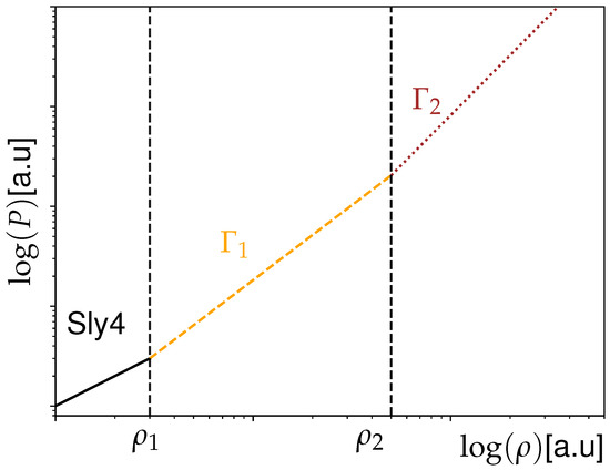 The piecewise polytropic model consists of a connected set of polytropic equations, effectively power-law-like functions, with different adiabatic indices to account for the softness/stiffness of the EoS at a given density regime. The indices are free parameters in most of the cases when one considers this kind of parametrization. The density where the transition between the polytropes takes place can also be used as a free parameter, specifically at highly dense regions [63]. The polytropic representation can yield macroscopic observables for a wide range of EoS with only a few parameters. The stellar structure maps the EoS parameters to gravitational mass, radius, moment of inertia and other global properties. This representation has been extensively used in NS studies and gravitational wave simulations [64,65,66,67] and can be tested using astronomical data such X-ray, gamma and gravitational waveforms. The representations can also be very useful when dealing with modified gravity such as [68,69] and other alternative theories where a coupling between geometry and matter could introduce corrections in the energy density and, therefore, requires an analytical representation to model the stellar structure [70].