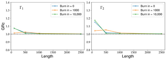 Gelmen–Rubin diagnostics for the case shown in Figure 2 for both (left) and (right). The Gelmen–Rubin coefficient , the black dashed line, shows the numerical convergence of the MCMC algorithm.