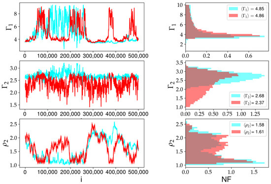 As a first step, we start by looking at the MCMC convergence of our calculations. To exemplify it, we take the case of and . Figure 2 shows the results of our algorithm for iterations obtained with two different initial values for . Figure 2a,d show the trace of the chain during the sampling process, and the respective moving average computed with length = 1000 is also shown. The posterior distributions are given in Figure 2b,e. Their mean values are and . Here, the posterior of has a broader shape when compared to . This behavior was verified for all initial conditions tested and will be discussed later on in this paper. The autocorrelation function is shown to vanish quickly as one compares values, with a lag of about 80 iterations in the chain.