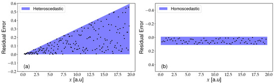 Representative example of heteroscedastic (a) and homoscedastic (b) residuals. Notice how the variance of the residuals changes with the value of x for the first, while it remains constant for the second.