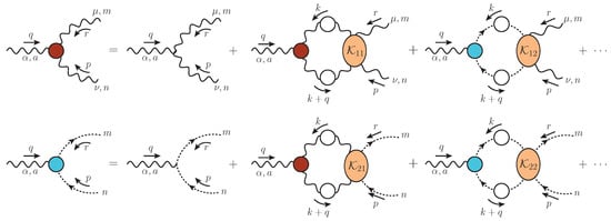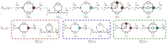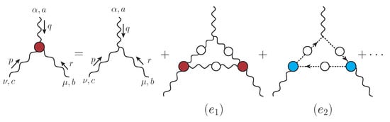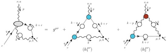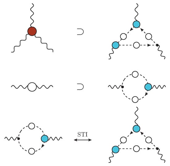 In order to appreciate in detail the reason why the STIs in Equations (20)–(22) are instrumental for the block-wise transversality, we will consider the case of ; the relevant diagrams are enclosed in the blue box of Figure 1.
