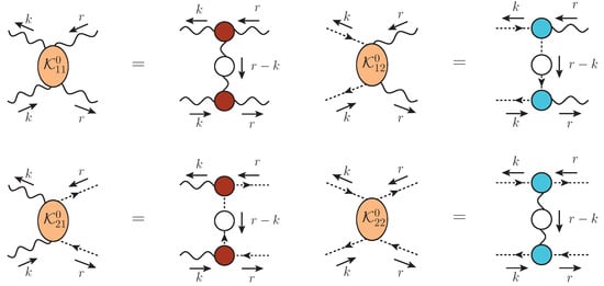 Given that the relations captured by Equations (5) and (6) apply also in the cases of and , one may define the corresponding self-energies and , as well as the functions and .