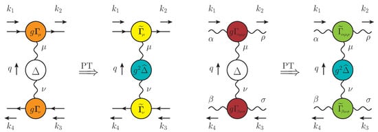 Quite interestingly, within the PT-BFM framework the transversality property of Equation (7) is enforced in a very special way, which permits physically meaningful truncations. In what follows we will predominantly employ the language of the BFM; for the basic principles of the PT and its connection with the BFM, the reader is referred to the extended literature on the subject [,,,,,,], as well as to Section 6 of the present work.