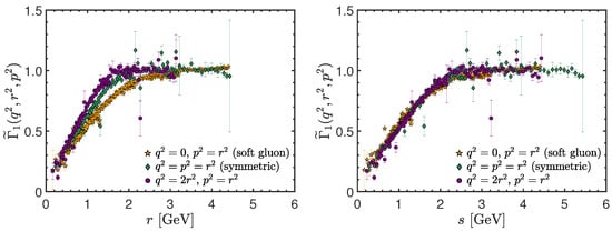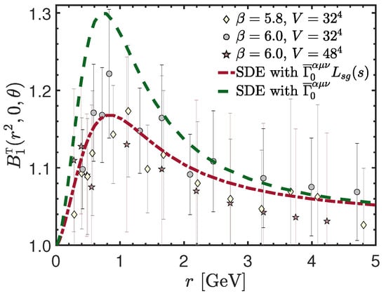 where we denote by and the conventional ghost–gluon [] and three-gluon [] vertices, respectively. Note that, by virtue of Taylor’s theorem [], is finite in the Landau gauge; its precise value depends on the renormalization scheme adopted, see Section 8. Moreover, denoting by the (wave-function) renormalization constant of , the Abelian STIs of the BFM impose the validity of the pivotal relation [,,]