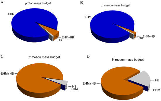 Mass budgets: (A) proton; (B) -meson; (C) pion; (D) kaon. Each is drawn using a Poincaré-invariant decomposition and the numerical values listed in Table 1 (separation at , calculated using information from References [40,41,42,43]).