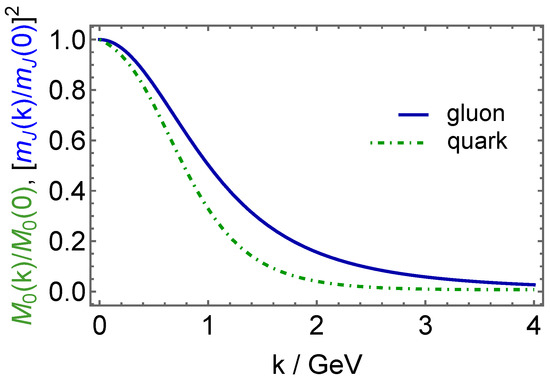 The existence of a Schwinger mechanism in QCD was first conjectured forty years ago [62]. The idea has subsequently been explored and refined [63,64,65,66,67], so that, today, a detailed picture is emerging, which unifies both the gauge and matter sectors [68]. The dynamical origin of the QCD Schwinger mechanism and its intimate connection with nonperturbative dynamics in the three-gluon vertex are elucidated elsewhere [36,37]. This is an area of continuing research, where synergies between continuum and lattice QCD are being exploited [69,70]. For our purposes, it is sufficient to know that Equation (6) is realised in QCD. Indeed, owing to their self-interactions, gluon partons transmogrify into gluon quasiparticles, whose propagation characteristics are determined by a momentum-dependent mass function. That mass function is power-law suppressed in the ultraviolet—hence, invisible in perturbation theory, yet large at infrared momenta, being characterised by a renormalisation-point-independent value [71]: