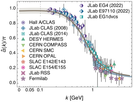 Process-independent effective charge, , obtained by combining modern results from continuum and lattice analyses of QCD’s gauge sector [71]. Existing data on the process-dependent charge [94,95], defined via the Bjorken sum rule, is shown for comparison—see References [95,96,97,98,99,100,101,102,103,104,105,106,107,108,109,110,111,112,113,114,115,116,117,118,119,120,121]. (Image courtesy of D. Binosi).
