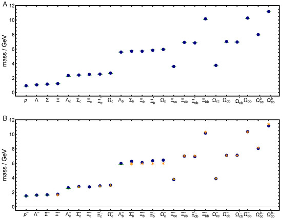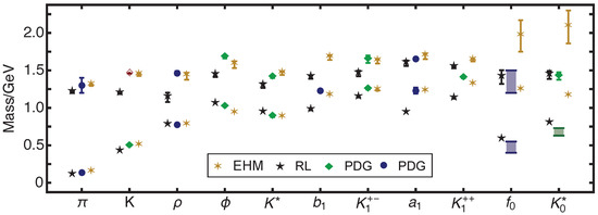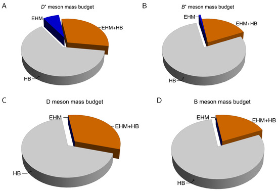 Conversely and yet still owing to EHM via its dynamical chiral symmetry breaking (DCSB) corollary, the pion is massless in the chiral limit—it is the SM’s Nambu–Goldstone (NG) mode [27,44,45,46,47,48,49,50,51,52]. Returning to the quark model picture, the only difference between - and -mesons is a spin-flip: in the , the constituent quark spins are aligned, whereas they are antialigned in . Yet, their mass budgets are fundamentally different: Figure 1B; cf. Figure 1C. An inability to explain this difference is a conspicuous failure of quark models: whilst it is easy to obtain a satisfactory mass for the , a low-mass pion can only be obtained by fine-tuning the quark model’s potential. Nature, however, does not fine-tune the pion: in the absence of Higgs boson couplings, it is massless irrespective of the size of and, in fact, the mass of any other hadron.