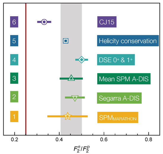 - Abrams, D.; Albataineh, H.; Aljawrneh, B.S.; Alsalmi, S.; Aniol, K.; Armstrong, W.; Arrington, J.; Atac, H.; Averett, T.; Ayerbe Gayoso, C.; et al. Measurement of the Nucleon / Structure Function Ratio by the Jefferson Lab MARATHON Tritium/Helium-3 Deep Inelastic Scattering Experiment. Phys. Rev. Lett. 2022, 128, 132003. [Google Scholar] [CrossRef]