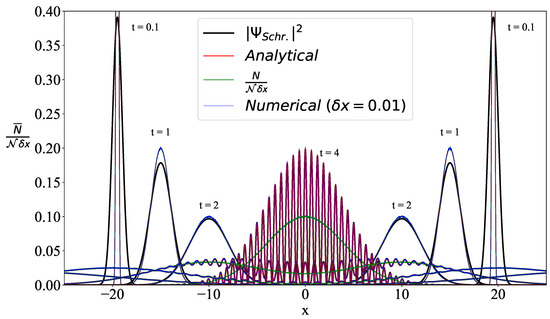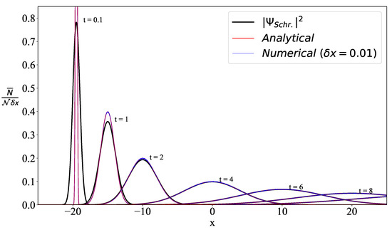 These are free particles that move at a constant velocity equal to their initial velocity obtained from the above Gaussian distribution. We follow = 10,000,000 of these particles and collect their phases in detection bins of spatial width along their trajectories. Their phases are then processed according to Equation (2). In what follows, units are chosen such that . In those units, spatial scales are measured in units of . Figure 1 shows the distributions of (blue lines) and compares them with the solution of Schrödinger’s equation for in Equation (6) in our units (black line). It is important that , as expected in a minimum spread quantum wavepacket. The two distributions are practically indistinguishable at all times 2. In this experiment, the detection spatial bin size is equal to