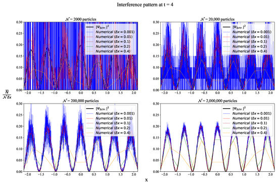 Development of the interference pattern shown in Figure 2 at time for various values of the detection bin size as the number of particles/experiments increases. Black line: solution to the Schrödinger equation at time , as in Figure 2. The red line corresponds to the bin size implemented to obtain Figure 2, namely . As , it takes a very long time for the interference pattern to develop clearly. For , particles are undercounted because of phase mixing in each detection bin. The interference pattern disappears altogether when δx is too large.
