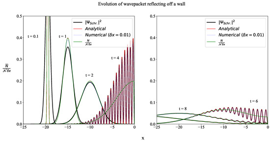 Figure 4 shows the excellent agreement between the numerical solution of the Schrödinger equation (black line), the numerical experiment of collecting 10,000,000 particles in detection bins of size (blue line), and the analytic approximation of Equation (32) (red line). In this particular example, there is no analytic solution to the Schrödinger equation.