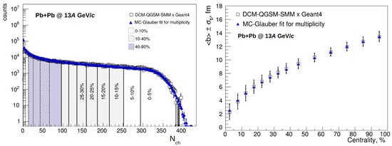 Below, we briefly discuss the well-established procedure of centrality (impact parameter) determination based on the charged hadron multiplicity and the MC-Glauber approach. In order to illustrate it, we used the DCM-QGSM-SMM model to simulate around 100 k minimum bias Pb+Pb collision events at = 13A GeV/c. At the next step, the sample of events was made as an input for the full chain of realistic simulations of the NA61/SHINE detector subsystems based on the GEANT4 platform and realistic reconstruction algorithms [22]. The fully reconstructed events were used to generate the distribution of the multiplicity of the produced charged particles with −0.9 3.1, see the left panel in Figure 1. In the MC-Glauber approach, the output from the 2M minimum-bias MC-Glauber Pb+Pb events was used to build the multiplicity of the produced particles . The multiplicity is modeled as a sum of particles produced from a set of independent emitting sources (“ancestors”) [13,14,23]. Each ancestor produces particles according to a negative binomial distribution (NBD) with mean multiplicity per ancestor and width parameter k: