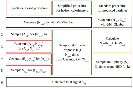 The goal of the developed procedure is to build the path from geometry parameters from the output of the Monte-Glauber Model to the observable related to the spectator matter. In order to do this, several steps are needed to model the fragmentation process of nuclear remnants, to determine the parameters of spectator fragments and to model the detector’s effects. The main steps of the developed procedure based on the Monte-Carlo sampling of spectator fragments are described below. The flowchart of this procedure is shown with the red boxes on the left-hand side of Figure 2. The main steps are the following: