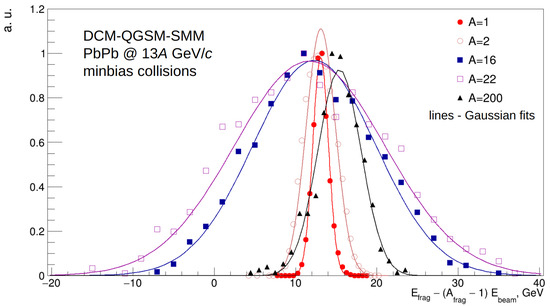 The procedure described in the previous section can be simplified based on the assumption that the distribution of the energy of spectators is Gaussian. This follows from the Monte-Carlo simulations based on the DCM-QGSM-SMM model, which realistically model the process of fragmentation of spectator fragments (see [18,19,20]). According to Figure 3, the energy distribution of a single spectator nucleon could be approximated with a Gaussian function. Distributions of heavier fragments are also close to Gaussian with mean values that are close to the product of the beam energy and mass number of fragments . Hence, the energy of spectator fragments can be treated as a combination of energies of single spectator nucleons distributed according to the common Gaussian function: