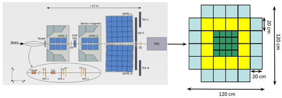 The validity of the procedure of centrality (impact parameter) determination based on the Monte-Carlo sampling of spectator fragments has been checked using the fully reconstructed DCM-QGSM-SMM model events and published data from the fixed target NA61/SHINE experiment (SPS, CERN) for Pb–Pb collisions at beam momentum = 13 A GeV/c [22]. The NA61/SHINE fixed-target experiment uses a large acceptance hadron spectrometer located in the North Area H2 beamline of the CERN Super Proton Synchrotron accelerator [28]. A schematic view of the NA61/SHINE experiment is shown in the left part of Figure 4. The main detectors are five time projection chambers (TPC): two vertex TPCs mounted in the magnets, a gap TPC covering the beam area and two main TPCs (left and right) measuring tracks of charged particles. The Projectile Spectator Detector (PSD) is a segmented forward hadron calorimeter with the transverse and longitudinal segmentations assembled of sampling lead/scintillators modules [26]. The transverse layout of the PSD detector is shown in the right part of Figure 4. The central part of the PSD consists of 16 modules with 10 cm × 10 cm transverse size and the outer region has modules with 20 cm × 20 cm size. PSD is installed 18 m downstream of the target and covers the polar angle of the projectile nuclei fragments emission . The acceptance of the PSD allows us to detect projectile spectators and produced particles emitted in forward rapidity region [26,27].