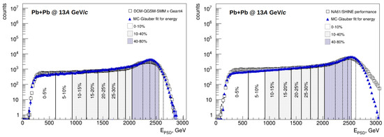 Figure 5 shows the distribution of the total energy of spectator fragments in the PSD calorimeter (open boxes) for the fully reconstructed DCM-QGSM-SMM model events (left part) and NA61/SHINE experimental data (right part). The data from NA61/SHINE experiment are taken from [22]. The results of the approximation of PSD energy distribution using a Monte-Carlo sampling of spectator fragments with Gaussian approximation for the energy of spectators (see Section 4.1) are shown by closed triangles. With the final set of parameters the mean value of impact parameter can be extracted for the centrality classes defined by the sharp cuts in the distribution, see the solid vertical lines in Figure 5. The events with a small value of have a small average (central collisions) and events with a high value of have a large average (peripheral collisions). In the case of fully reconstructed DCM-QGSM-SMM model events, the MC-Glauber fit for energy describes the distribution quite well, excluding very central collisions. This needs to be addressed by future studies. The situation is the opposite in the case of the real data. Here, the MC-Glauber fit for energy does not describe well the distribution for very peripheral collisions, see the right part of Figure 5. This difference is expected to be reduced in the future by accounting for effects due to spectator fragmentation in the full procedure described in Section 4.