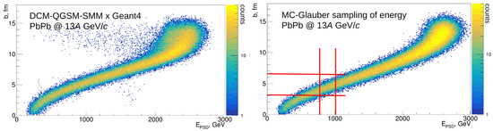 Figure 6 shows the correlation between impact parameter b and the total energy in the PSD calorimeter for fully reconstructed DCM-QGSM-SMM model events and detector response obtained with the GEANT4 package (left part) and the results of the Monte-Carlo procedure based on Gaussian approximation for the spectator’s energy (right part). Red lines show the regions used to map impact parameter b and energy in a certain centrality class.