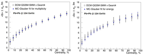 The right panel of Figure 1 shows the centrality dependence of the mean value of impact parameter and its standard deviation extracted directly from the DCM-QGSM-SMM model (open symbols) and from the MC-Glauber approach (closed symbols). Overall good agreement is observed.