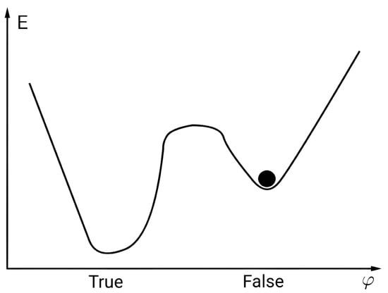 Let us consider the mechanism for producing PBHs by means of scalar field dynamics. First-order phase transition as a mechanism to produce black holes was proposed by Khlopov et al. []. For a realization of this mechanism, it is necessary that the field potential has at least two minima, and one of them must be false. Let the field be in a false vacuum  at the initial moment of time, and let us denote the true vacuum by  (Figure 1). As a result of quantum tunnelling, in one region of space, the field will have a value of  and in another region of space, . These regions are called bubbles. In this formulation, the free energy of a bubble consists of two parts, the volume and the surface energy. We denote the surface energy density  and the difference of potential values at minima . In this case, the free energy of a bubble with radius R and the surface energy density  can be written as