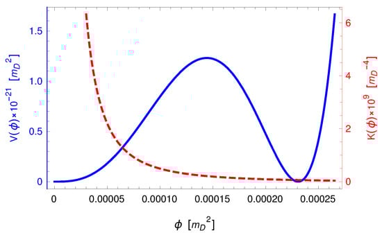 The right minimum of potential (12) (Figure 2) corresponds to the observable universe [,], while the left minimum corresponds to the case of macroscopic extra dimensions, but due to the nontrivial kinetic term (11), it is impossible to reach the left minimum of the potential in finite time.