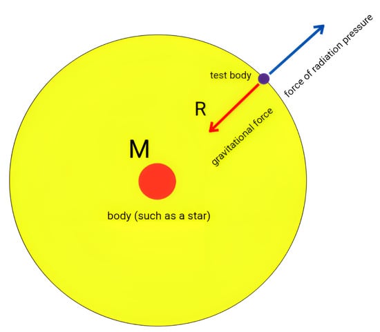 The gravitational force acting on the test particle with mass m is , and the radiation pressure is given by the formula , where  is the flux and the denominator is