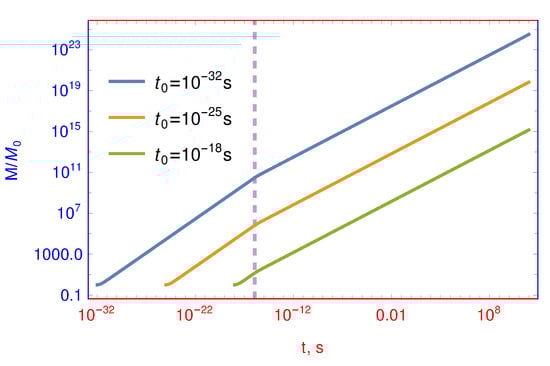 In 1933, McVittie studied the influence of cosmic expansion on local physics [] and derived a specific metric given by (28). The mechanism of generation of PBH proposed in [] within the modified gravity framework possibly allows one to produce them practically immediately after the cosmological inflation. The question about the growth of mass of a PBH with the evolution of the universe naturally arises. Since there are no observational data on this distant period of evolution of the universe, it is necessary to estimate the influence on the final result of the free parameters of the problem, namely, the parameter () and the moment of the end of reheating . Of course, the initial mass of a black hole is also a free parameter; however, taking into account the fact that the early universe is still very rapidly expanding, it is necessary to consider an accretion model of matter taking into account the expansion of the universe. In [,], exact solutions to the accretion problem were considered. The solution with the McVittie metric and the energy–momentum tensor of a nonideal fluid with a radial flow is of most interest for the evaluation of the accretion in that case. In that model, it is possible to calculate how many times the mass of the PBH will change, as the mass of the PBH grows with the universe, depending on the state parameter .