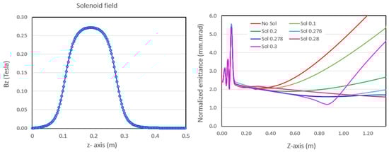The solenoid field was applied to compensate for the transverse emittance, as it is used for beam focusing and transverse emittance conservation. The space-charge field produced by electrons emitted from the cathode can cause defocusing forces and lead to transverse beam expansion at the beginning of acceleration. This study investigates the effect of solenoid magnets on the transverse beam emittance downstream of the gun. The solenoid magnet is placed 0.189 m downstream of the RF gun. A magnetic field generated by solenoid magnet is shown in Figure 5 (left). It refers to the field distribution in longitudinal direction. The transverse beam emittance can be optimized by using the solenoid field. Figure 5 (right) presents the transverse beam emittance at various solenoid magnetic field strength. To investigate the proper solenoid magnetic field with a charge of 1 nC, the injection phase was varied from −16 to 0 degrees and changed the solenoid field from 0.26 to 0.28 Tesla. The parameters of laser pulse were kept unchanged with using a laser pulse of 8 ps and spot size of 0.5 mm. It was found that the optimal solenoid magnetic field is 0.278 Tesla with a fixed RF phase of −6 deg.