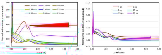 Transverse normalized emittance along z-axis versus (left) laser spot size and (right) longitudinal pulse distribution for 1 nC bunch charge with 0.5 mm laser spot size.