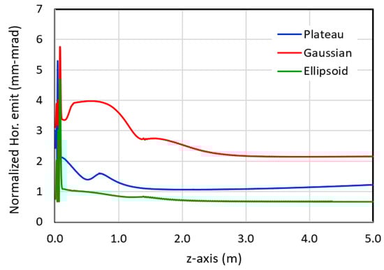 However, although an ellipsoidal distribution can result in a minimum emittance, obtaining such a shape can be complicated using techniques such as SLIM []. In this system, a plateau shape is considered more suitable. Therefore, the electron beam with emittance of 1.2 mm-mrad at the end of linac and beam size less than 0.1 mm was obtained.