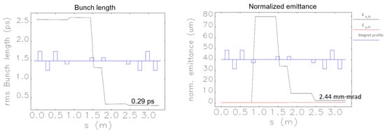To simulate a bunch compressor, the electron bunch was modeled using Elegant []. As the chirped electron bunch passes through a chicane bunch compressor, the dipole magnets within the chicane cause electrons with varying energies to travel different distances, leading to a partial reversal of the energy chirp, which refers to the variation of electron energy within a bunch. To obtain the minimum bunch length after compression, the longitudinal phase space prior to the chicane magnet must be suitable and match the energy chirp of the initial bunch. Figure 9 shows the bunch length and normalized emittance along z-axis during compression. The electron bunch length and emittance are 0.29 ps and 2.44 mm-mrad, respectively. Although the resulting emittance after compression reaches to 2.44 mm-mrad, it did not significantly impact on the generation of THz radiation. To ensure that the electron beam has suitable optics for entering the undulator, triplet quadrupoles and doublet quadrupoles are placed downstream of the undulator to minimize the electron beam size to less than 1 mm. However, the generation of THz undulator radiation could be affected by the presence of space charge, particularly in scenarios with high bunch charge beam under the condition of high-filed undulator. In the upcoming step, an in-depth investigation will be carried out to determine the influence of the undulator magnetic field on the electron beam.