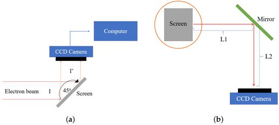 Schematic layout presenting the top view (a) and side view (b) of the transverse beam measurement setup. This setup comprises a phosphor screen, a CCD camera, and a computer for data acquisition and analysis.