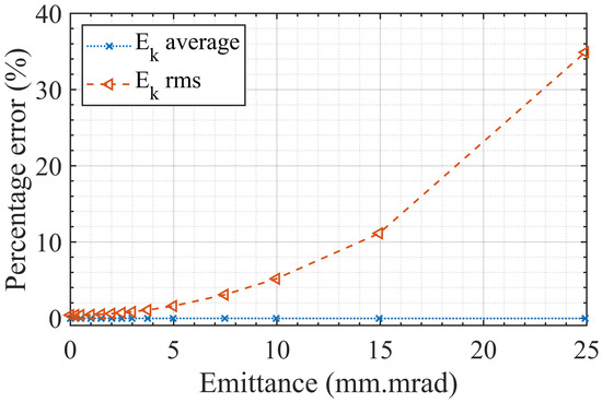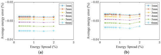 The investigation of the influence of transverse beam emittance on the accuracy of energy measurement was conducted. A Gaussian distribution electron bunch was generated with an rms beam size of 3 mm, an average energy ranging from 5 to 25 MeV, an energy spread of 0.5%, a bunch charge of 100 pC, and emittance values ranging from 0 to 25 mm·mrad. Simulation results for an electron bunch with an average energy of 5 MeV are depicted in Figure 6. The findings reveal that the systematic error in measuring the average kinetic energy remains below 0.1% for all emittance values. However, the systematic error in measuring the energy spread increases as the emittance value increases. When considering a systematic error threshold less than 10%, it is advisable to limit the emittance value to below 12 mm·mrad. For an even more stringent requirement of a systematic error below 1%, the emittance should be maintained below 4 mm·mrad.
