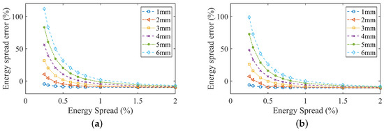 Systematic error of energy spread measurement for electron bunch with average energy 5 MeV (a) and 25 MeV (b), considering values of initial energy spread and transverse beam size.