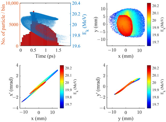 In this section, the energy measurement system was investigated through the beam dynamic simulation of an electron bunch with practical electron beam conditions, following the second scenario described in Section 2.3. The electron distributions obtained from the start-to-end beam dynamic simulation are represented in Figure 7. At the considered experimental station, the electron bunch exhibited a charge of 117.6 pC, a duration of 0.36 ps, and an average kinetic energy of 20.07 MeV, with an energy spread of 0.55% (equivalent to an energy spread of 111 keV). The horizontal and vertical beam sizes are 3.45 mm and 3.60 mm, respectively. Additionally, the horizontal and vertical emittance values are 0.41 mm·mrad and 0.25 mm·mrad, respectively.