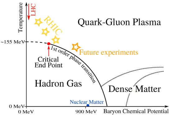 For this reason, the generally accepted knowledge in the physics of dense, strong-interacting matter largely comes from low-energy effective models, which are consistent with the first-order chiral phase transition at low temperatures and high baryon densities, as is shown in Figure 1; some experimental evidence for this transition can be found in [].